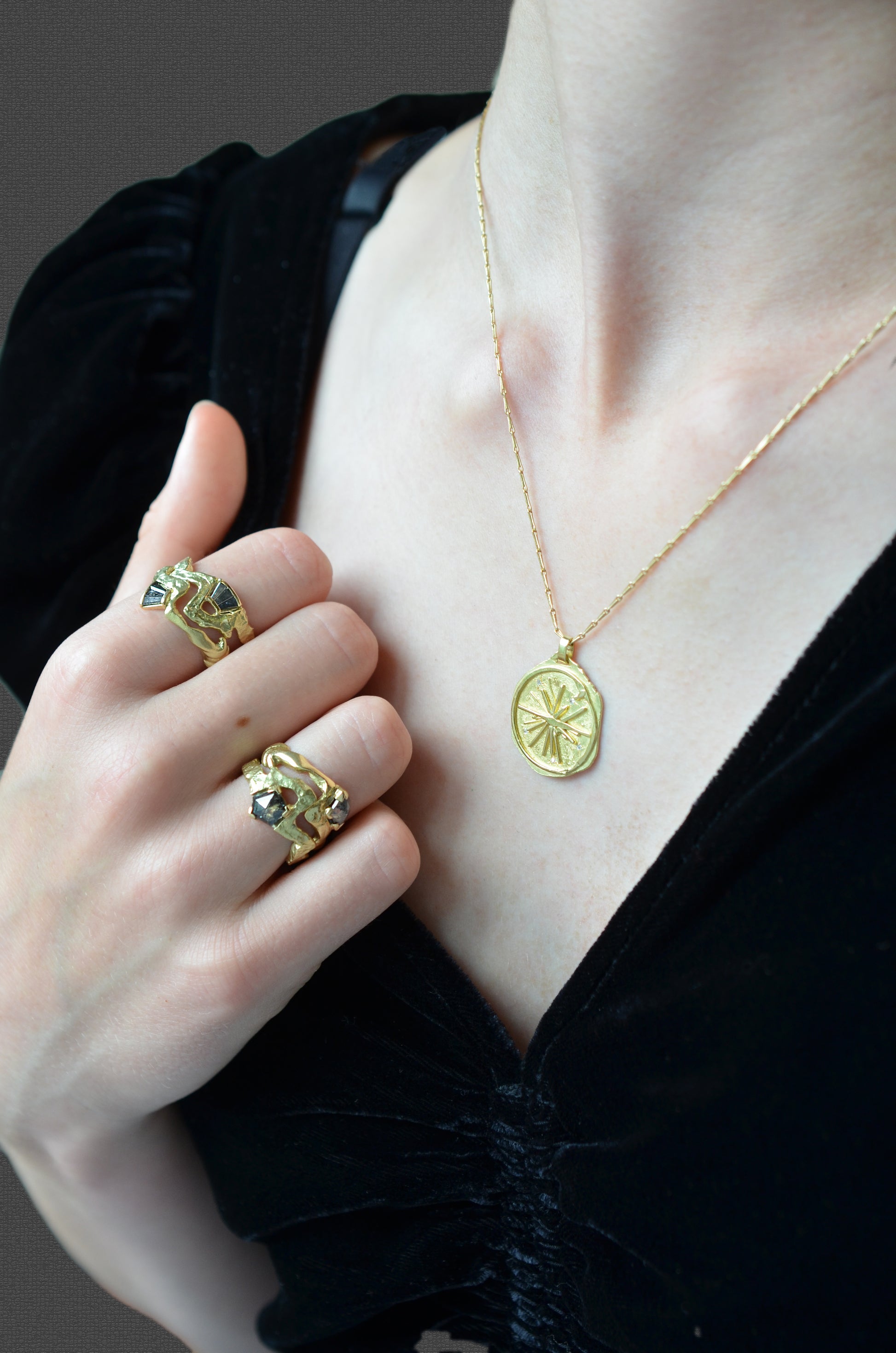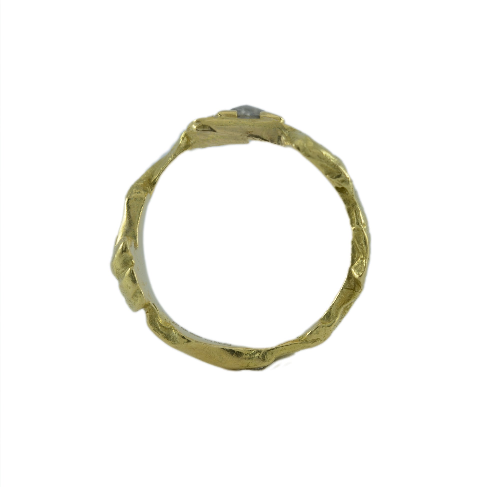 The ring was born from the flames, emerging as Alexandra's signature 18 carat molten gold design. The tapered baguette diamonds complement the shape, while the intentional process marks and textures are part of the jewel's becoming, drawing your attention to the long history inherent in the material itself. The ring therefore invites you to embrace and add the marks of your own story over time.