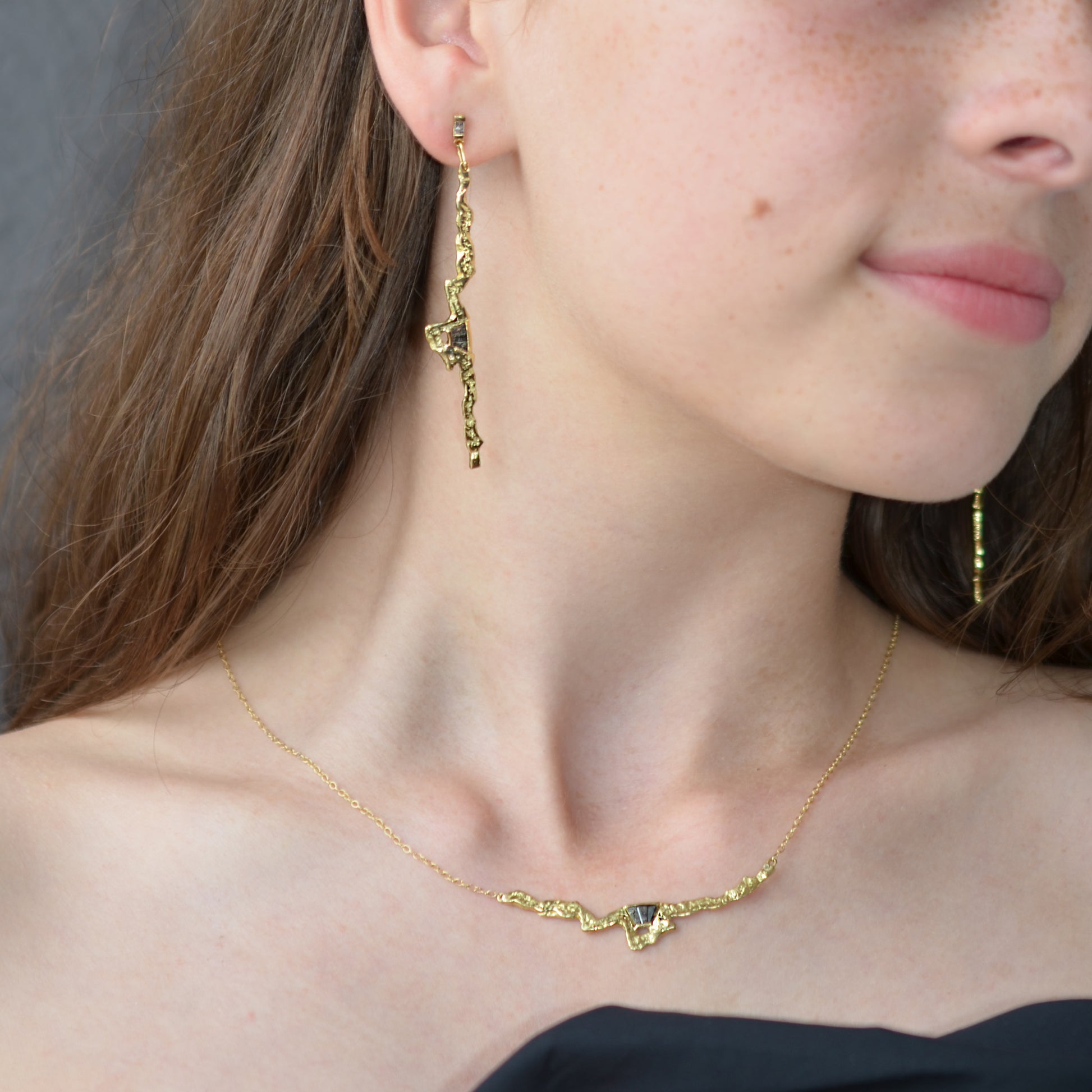 The softly jagged gold bar with its unique fan of ombré baguette diamonds beautifully underlines the collar bone.